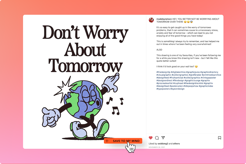 When I’m browsing social media and see a visual or post that inspires me or makes me laugh, I right click and save it to mymind. It feels like the safest place to keep it, since mymind saves it even if it’s deleted from social media.