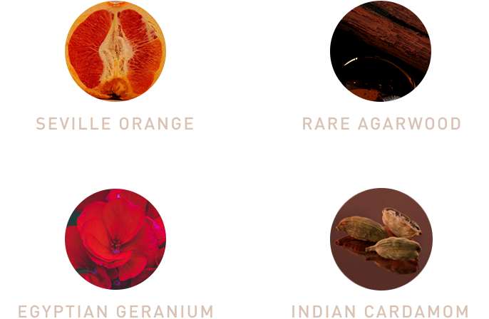 Our intense and complex Fall Fragrance is bursting with verdant top notes of bitter citrus, heart notes of geranium, and base notes of essential oud—a rare and precious oil made from tropical agarwood.