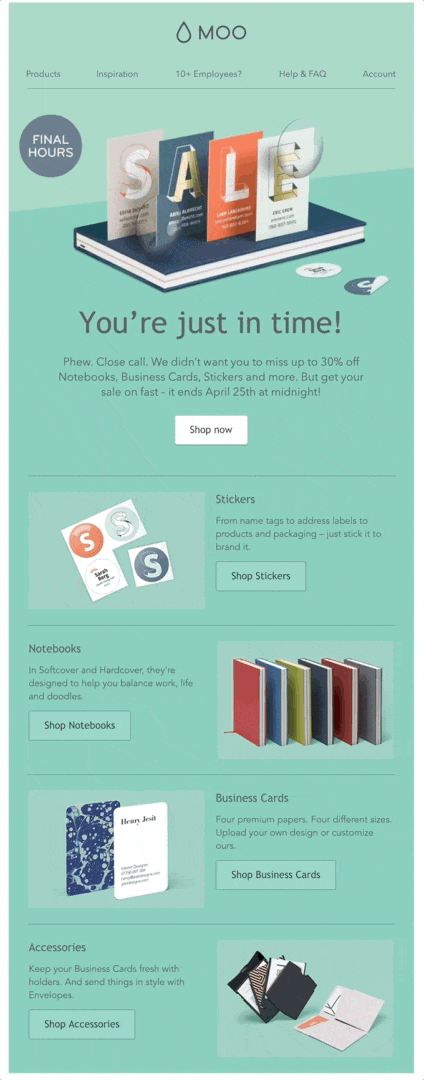 We usually show a nice photo at the top, instead of text. So we try to put all of the pertinent info right at the top of the email, very attention-grabbing. So the word "sale". What the discount is, how long it lasts, et cetera.