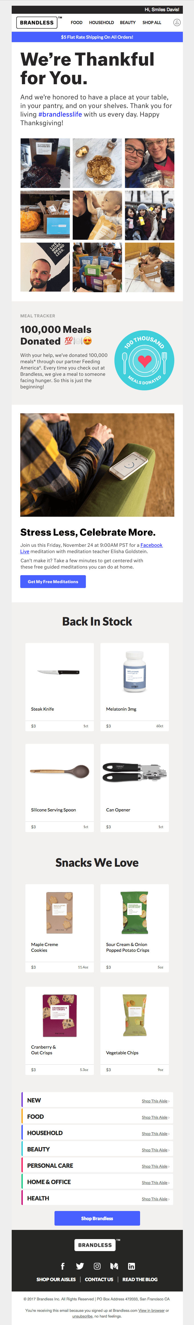 While this email might only say “fall” with its hero image (and with the giant pumpkin further down in the email), the newsletter focuses on gratitude, a common theme in celebrating the holidays.