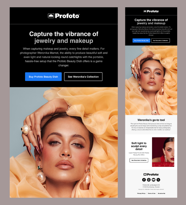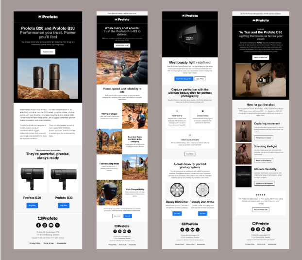 If you’re not familiar with the brand, Profoto builds tools for photographers, so visual quality is a big deal. That makes their emails an interesting case study in how design systems and brand rules translate into email.