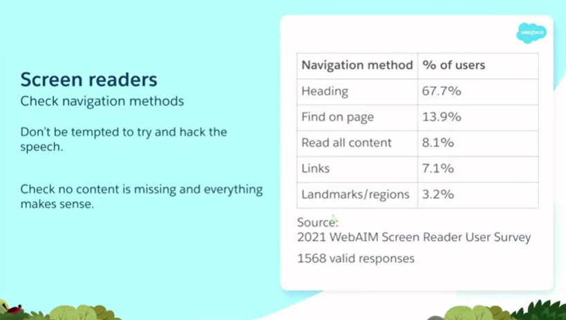 How are people using screen readers? The main ways people navigate come from the WebAIM Screen Reader User Survey of 2021. The main way people navigate with a screen reader is by using headings. It is crucial to include headings in your code and ensure they are structured correctly. 67.7 percent of people say this is the first navigation method they try. If headings are not available, they proceed to other methods. So headings are the most important thing we need to worry about.