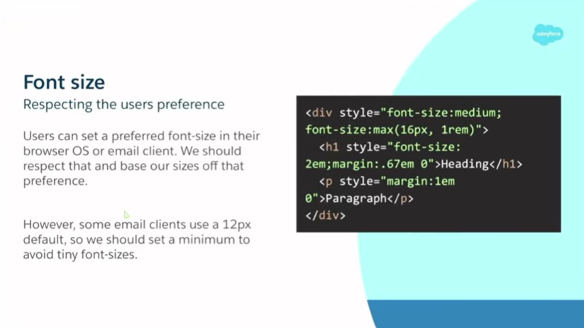 Next up, font sizes. In accessibility, we often discuss font size. What is a suitable font size for accessibility? Many people say 16 pixels, and that is true. Sixteen pixels is a good minimum font size to use. Some say 14 pixels. Sixteen pixels is a good font size. But what is better is medium or 1rem. What we are doing there is taking what the user has selected. In their OS settings, browser settings, and email client settings, users can set their preferred font size, and we can use that and base all our sizing on it. We do need to do a bit of a reset and set a minimum because Apple Mail, for some reason, thinks that 12 pixels is suitable for a default font size. They are wrong. Outlook is much better than Apple Mail. So we need to set a minimum. That is what this code is doing here. I won't go into it too much, but I will show you an example of how this works.