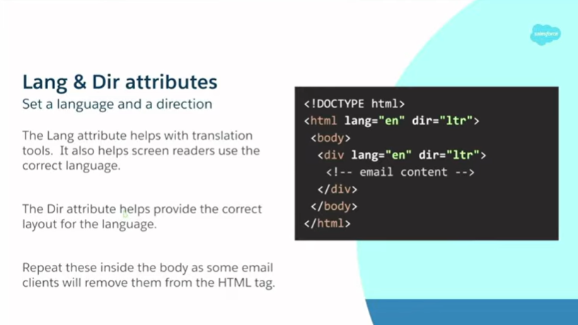 I will start by going through a few key points. I have some code up here. I will try not to discuss code too much. I love it, but not everyone does, and I understand that, and I have a problem. We will discuss the code briefly, but I'll try to cover it quickly. The idea is that I will share these slides afterwards. If you are a developer, you can use this. If you are not, you can pass it to the developers on your team. Language and direction attributes. Language attributes are great. They help with translation tools and with screen readers. If I have my email client set to English and someone sends me an email in French without setting a language, my screen reader will read everything as if it were in English. It will read it with an English accent and mispronounce all the words. It will sound like Del Boy trying to speak French, and it does not really work.