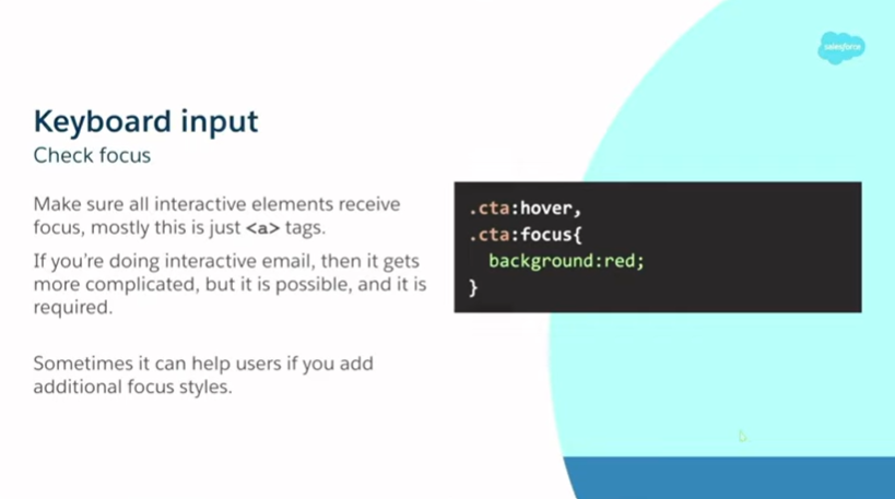 Next up, keyboard inputs. This is something I use a lot because of my owie finger, as it is called. The main thing with keyboards is ensuring that everything is clickable. All your interactive elements must receive focus and be interactable and clickable. Luckily, in email, generally this just means your a tags, and you do not really need to do anything extra. Just do not disable focus. Do not put a focus selector with outline: none. Do not do any of that. That is just going to break it for no reason. Most of the time, this is already there for us. If we are doing an interactive email, it gets more complicated because we still need to be able to use the keyboard to navigate it. We need to be able to see that focus and to interact with it. It is both possible and required. I do not have time to talk about it now. It is another couple of hours of chat. However, if you are interested, feel free to discuss it with me, and I can show you some examples.