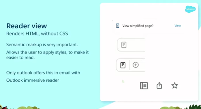 Another thing I use a lot is Reader View. This is more of a web-based thing, but it is also coming to email, and I hope it will eventually come to email more frequently. Currently, it is only in Outlook with Outlook Immersive Reader, but I expect other email clients to do it. I hope they do, because I think it is a really good enhancement. What it does is take your code and your HTML, strip all the styles off it, and then allow the user to apply their own styles to make it more readable for them. I use this a lot on websites, particularly news websites and especially local news, as well as on recipe sites where pop-ups and other elements clutter the page, making it difficult to find the actual content. Go into Reader View and you can.