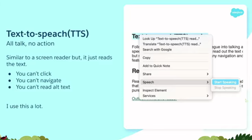 Text-to-speech is another thing. This is the technology that screen readers are built upon. It is also the technology behind smart speakers and voice assistants. It takes text and turns it into speech, but this is just the basics. There are no clicks, no navigation, and it cannot read alt text. So you might think, what is the point of it? Nobody is going to use that. That is what I thought when I first looked at it. But I actually use this a lot now. In my day-to-day life, not just for testing. I am dyslexic. I struggle with reading. It takes a lot of processing power for me to read something. If I am trying to take in complex information while reading, I spend a lot of my energy and thought process on the act of reading, and I don't have enough left over to process the information and understand it. If I could have it read out to me, it would make it easier. Also, if there is a word you do not know, it is useful to say it out loud. I will show you an example. If I scroll down to my text-to-speech section and highlight it. Let us make it bigger as well. Look at that zoom. It is useful. What does that say? It says: “Following on from screen readers is good for talking about text-to-speech readers.” I have no idea what that is about. I mean, I do, I ran through it earlier in the hotel room, but this is for show. Then we click and go to Speech, Start speaking: “Following on from screen readers is a good segue into talking about text-to-speech readers.” Segue. Who thought that it was spelled like that? It makes no sense. But things like that are a real example. I had no idea what this was. So I did a search and found out. It is very useful. I only discovered this because I was conducting accessibility testing. Now that I have found it, I use it all the time in my day-to-day life.