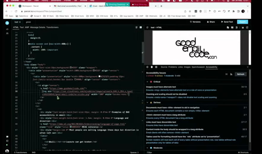 The team at Parcel tested over 6,000 emails with their email accessibility checker. Out of those 6,000 emails, 50 percent had at least one critical issue. Half of them. Half had a critical issue, the kind that should not be sent. Out of those 6,000 emails, two passed. Two emails out of 6,000. That is 0.03 percent of emails that were accessible. That is ridiculous, right? And this is not hard stuff. This is easy. This is Parcel. Some of you may already have accounts. Setting up an account is easy. Do it there. Then, if we go down to the bottom, the accessibility tab is there. Click that, check accessibility, and it will take a minute to run through. Here, we have two critical issues, five serious issues, and one moderate issue. This is really easy. I can click and see, okay, first one: images must have alt text. I can click a link and read more about it if I want to find out why images need alt text, if you don't already know. You can also click there, and it will take you to the line in the code where the bug is located, allowing you to fix it. This is a five-minute job. And two emails out of 6,000 have done this.