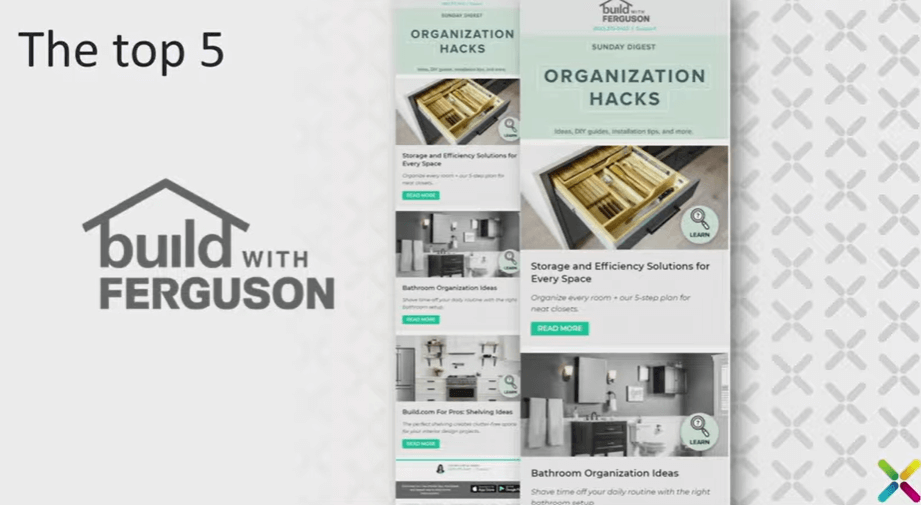 Ferguson, ranked number five, did some good things and some not-so-good things. What they did well was understand their audience. They send out a digest on Sundays, focused on home improvement—organizing kitchens, bathrooms, that sort of thing. They found that Sunday is a good time to reach people working on their homes. It’s all about organization. If you look at their CTAs, they aren’t “Buy now,” because this is a useful email. The CTAs say “Read more.” It’s an actual digest. Let’s be honest: once you click through, you can make a purchase. But it creates an environment where the email feels useful rather than pushy or salesy.