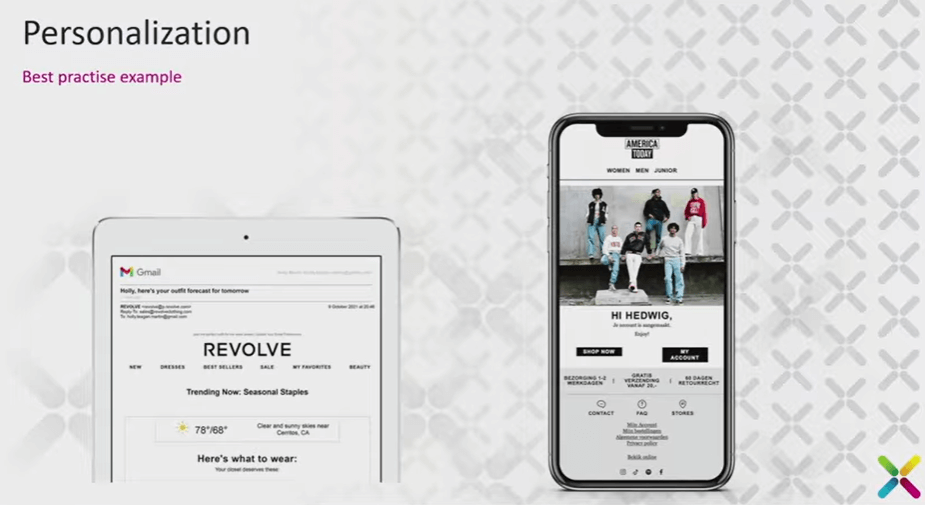 Two examples. Revolve utilized name personalization in the subject line and also incorporated subtle geo-based personalization within the email, such as tomorrow’s local forecast with a styled outfit guide. It did not rely only on a first name. America Today used basic first-name insertion.