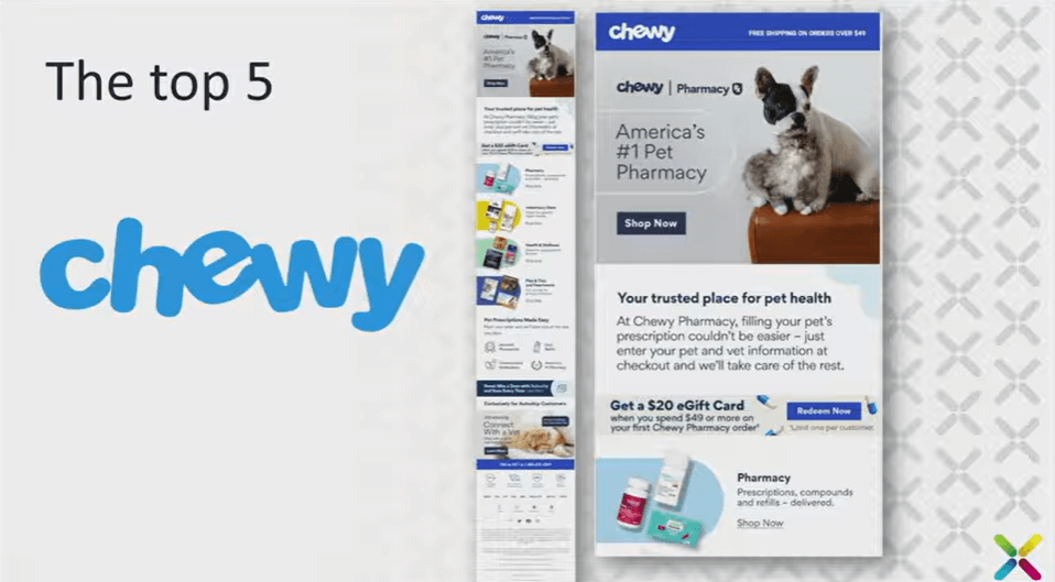 Chewy placed number four. They excelled in a few areas, but also made some mistakes. When this email lands with images off, you see almost nothing because it’s entirely image-based. That’s not necessarily terrible—most people have images on—but imagine if you’re visually impaired. There’s no alt text either, so it falls short. There’s useful content in there, but near the bottom, there were two issues. The first is the unsubscribe link. I always say, don’t hide it at the bottom. Move it to the top. If someone’s going to unsubscribe, they’ll do it anyway. Hiding it is like knowing you’re about to get dumped and ignoring all their calls and texts—it’s going to happen. Let it happen. At the very least, take them to a preference center where they can manage their choices. The second issue: the “View in browser” link was at the bottom. But if your images are off, you won’t even see it. So that placement didn’t make much sense. Still, they did some good things, too.