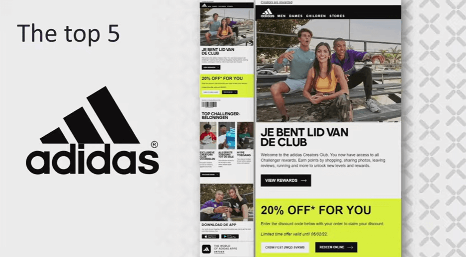 Adidas in the Netherlands also performed very well. The copy was in Dutch, but the design was consistent across the board, with great customer service and well-structured emails. They had GIFs, strong content, and effective app promotion.