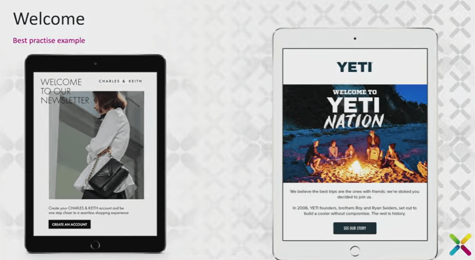 Two quick examples about “what to do next.” Charles & Keith connected the email sign-up with account creation. Too often, there is no connection between creating an account and subscribing to email. If there is no connection, that's fine, but at least ensure the account creation email is on brand. Too many look like they fell off the back of a van. Charles & Keith’s message was branded and guided people to complete that step. YETI immediately welcomed subscribers to “YETI Nation,” creating a sense of belonging. One of the first actions they encouraged was not to say, “Go buy now,” but rather, “read our story.” Explain why you are different. We all have something unique to say, and many people will buy from you because they connect with your story.