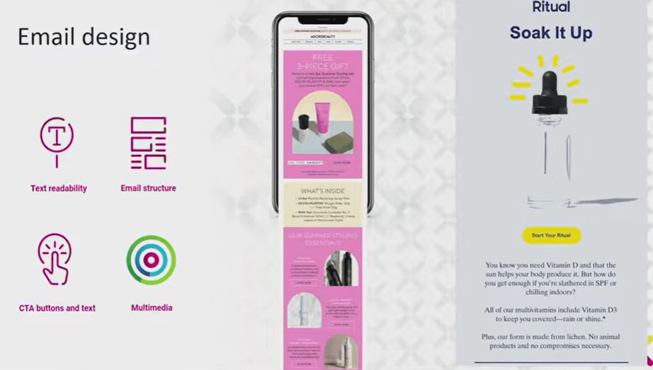 This example from Adore Beauty is nicely designed—featuring great colors and strong imagery. You did a presentation recently, Mike, about arches, right? Yes, arches are good. Ritual also incorporates a significant number of GIFs into its campaigns. People say a picture is worth a thousand words; a GIF must be worth a lot more. I love them. Don’t be a one-trick pony, though—mix it up. GIFs can also be educational, showing users how to use a product or feature, which makes them useful beyond their aesthetic appeal.