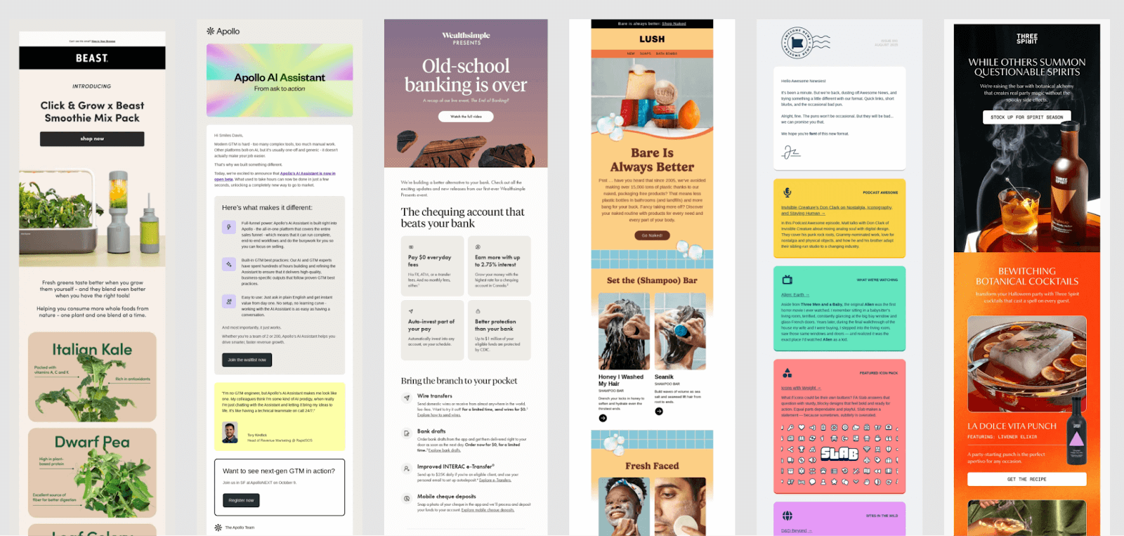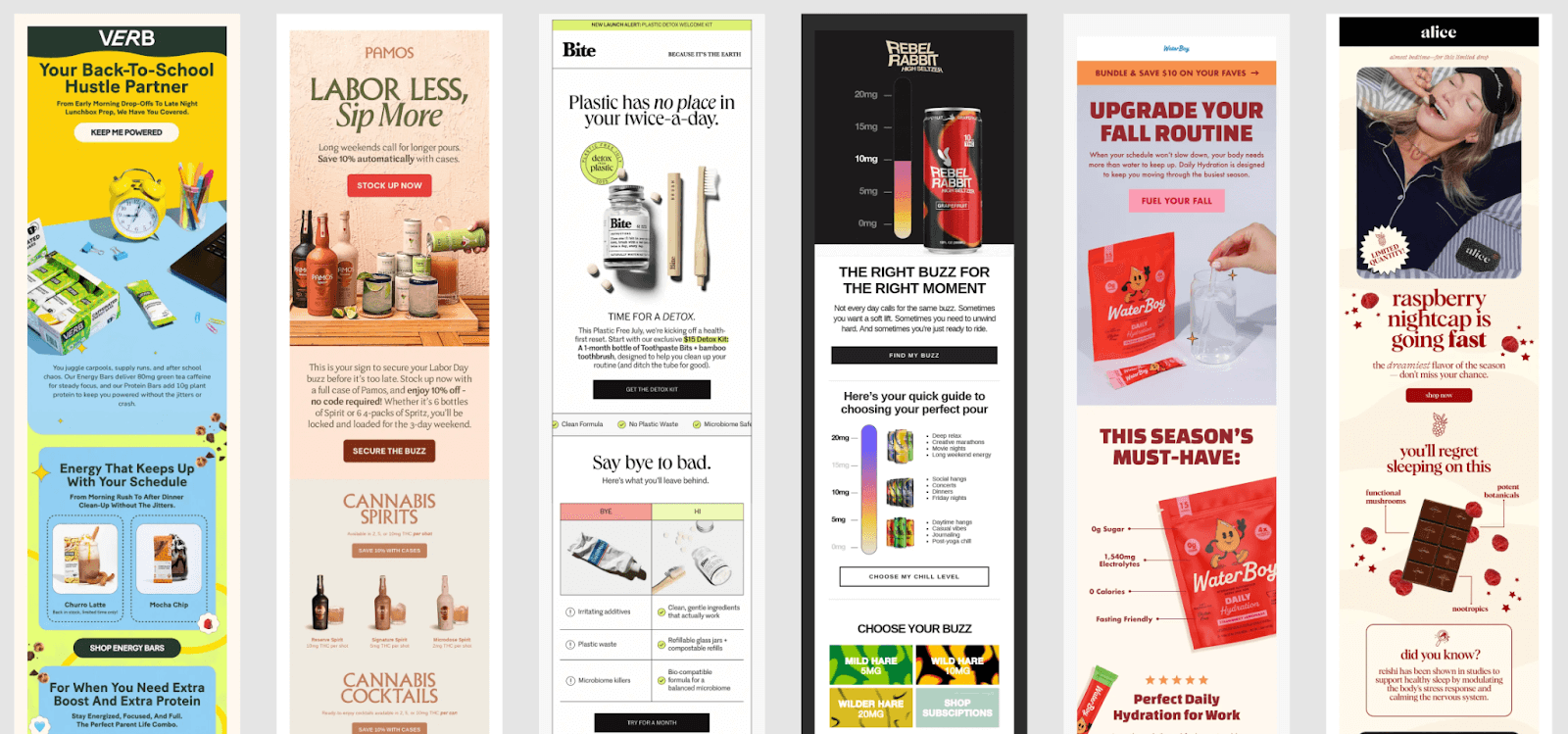 All six of these emails (Verb, Pamos, Bite, Rebel Rabbit, Waterboy, and Alice) share the same design DNA: calm vertical rhythm, confident simplicity, and product-as-routine storytelling. They don’t shout for attention; they guide you through a ritual.