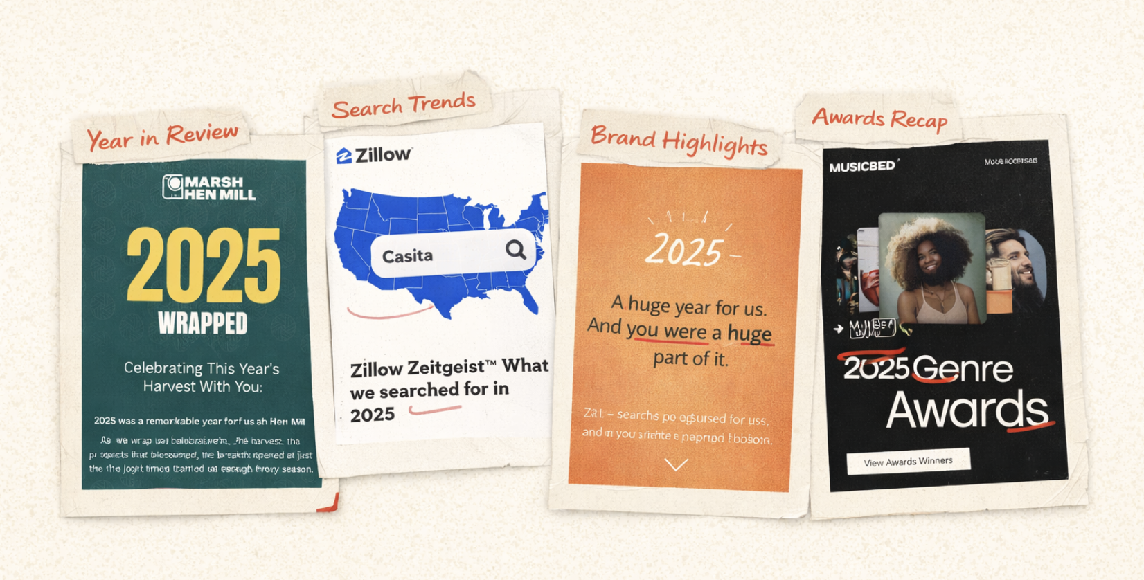 Examples (all that fit): Marsh Hen Mill (2025 Wrapped), Bellroy (year recap), Musicbed (Genre Awards), Zillow (Zeitgeist report).